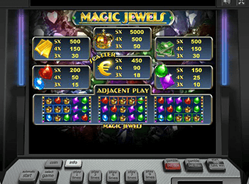 Слот-машина Magic Jewels от Novomatic, где сюжет посвящается драгоценностям. Когда новые игры загрузятся, на дисплее покажется внутреннее пространство пещеры, где на стенах красуются разноцветные кристаллы. На фоне этой картинки запустившие игровой аппарат гэмблеры заметят синеватые вращающиеся элементы, разделенные тонкими желтоватыми линиями.